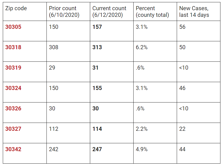 The Fulton County Board of Health tracks the number of COVID-19 cases by zipcode. Their latest update is from June 12th, 2020. These are the statistics for confirmed COVID-19 cases for the zip codes located within District 54: