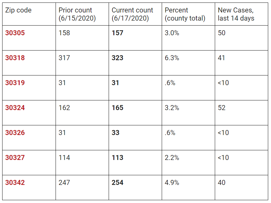 This week we also had our highest daily total to date (on Saturday), at 1800 cases in a single day.The Fulton County Board of Health tracks the number of COVID-19 cases by zipcode. Their latest update is from June 17th, 2020. These are the statistics for confirmed COVID-19 cases for the zip codes located within District 54: