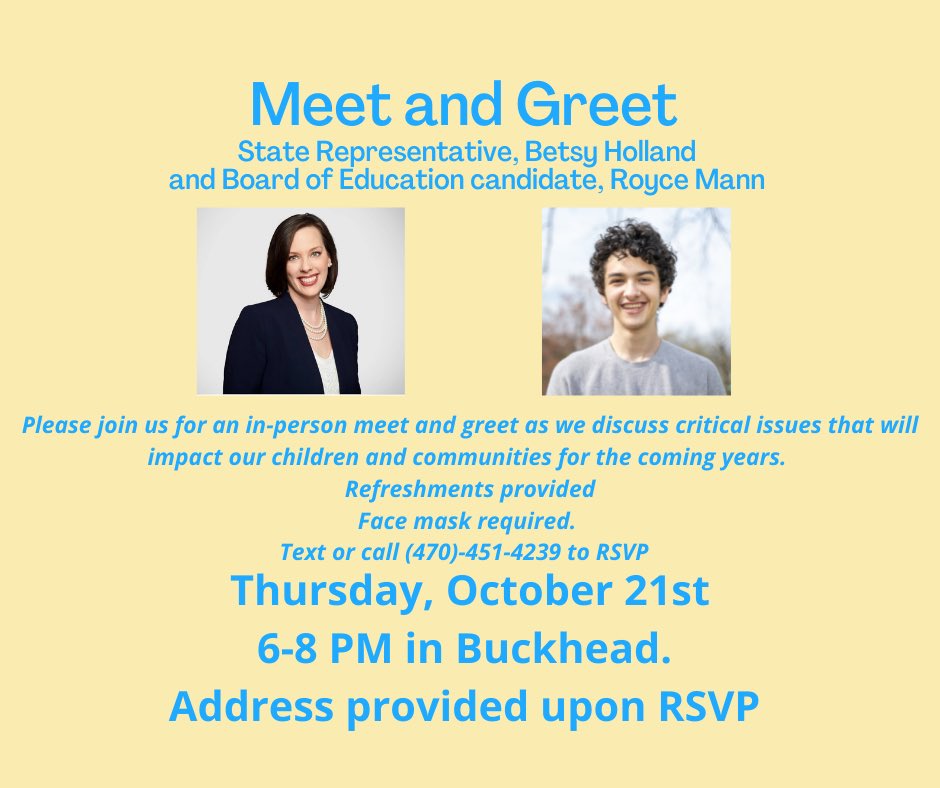 On Thursday evening, join me & Atlanta Board of Education candidate Royce Mann for a meet and greet in Buckhead, from 6-8 pm. Text or call (470) 451-4239 to RSVP and receive the address.