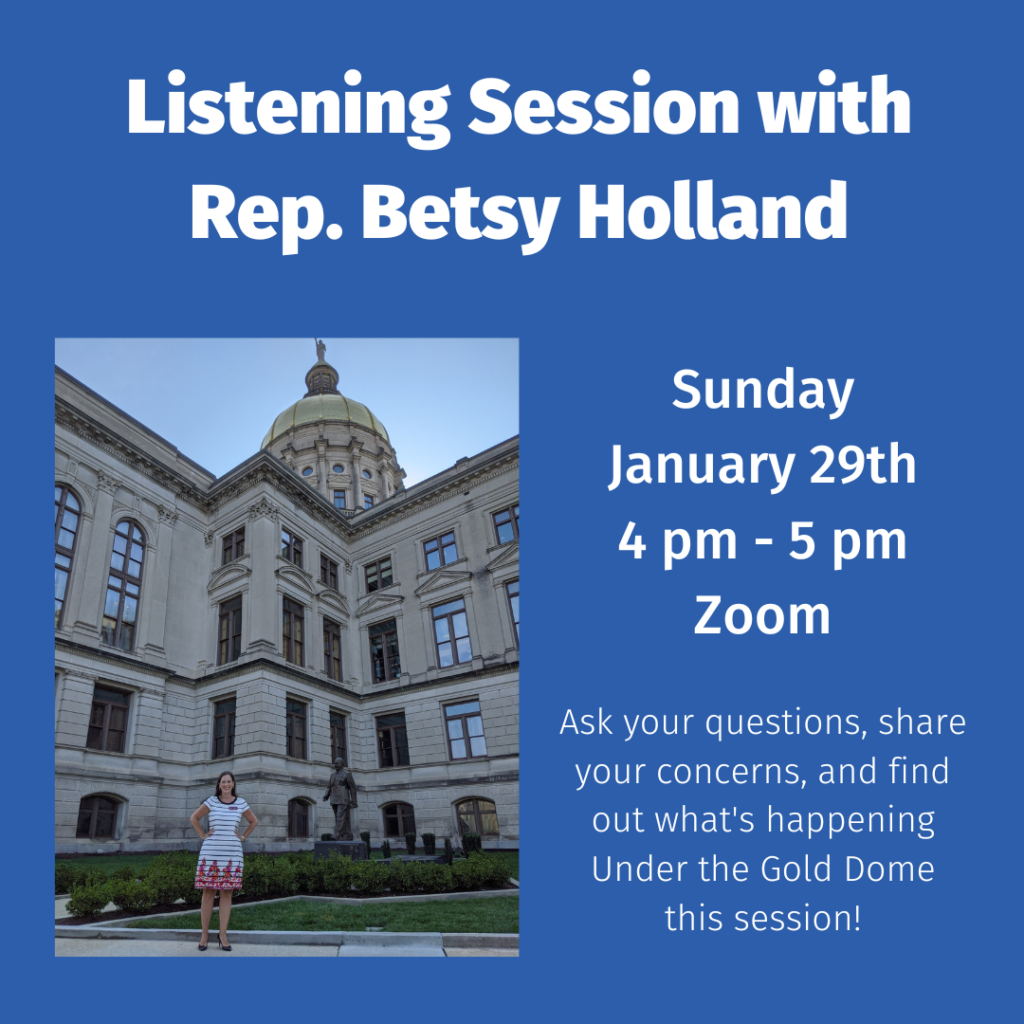 As your Representative, your concerns are important to me. Please contact me at betsy.holland@house.ga.gov or 404-656-0116 with questions, concerns, or solutions you may have regarding legislation or other happenings in District 54.